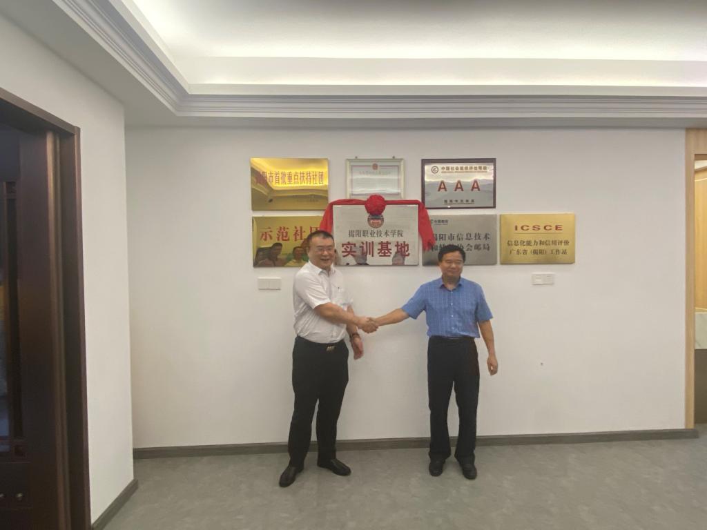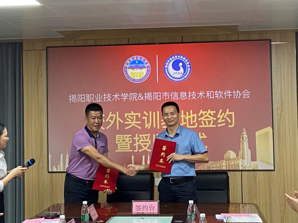 随后,学校副院长李桂鑫代表学校与揭阳市信息技术和软件协会签订校外实训基地协议书;罗恢远院长与揭阳市信息技术和软件协会邝兴望会长共同为基地揭牌。