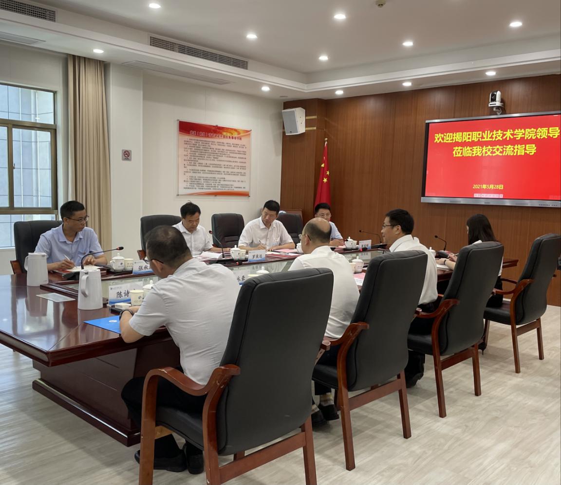 5月28日上午,德赢官网罗恢远院长率领党政办公室、工会、电子商务创业学院相关负责人等一行到访汕尾职业技术学院进行交流,受到汕尾职业技术学院党委副书记、院长蔡昭权及相关部门负责人的热情接待。双方在汕尾职业技术学院科学楼三楼会议室交流座谈。
