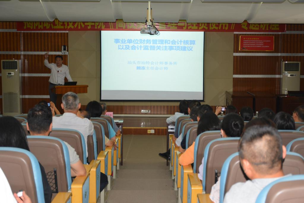 5月12日下午,财务处邀请汕头市汕特会计师事务所所长、中国资深注册会计师赖冻来校做专题讲座。学校党委委员、副院长刘瑞叶,学校党委委员、人事处处长张汉良出席,各系(部、院)及行政教辅部门负责人、各党(总)支部书记、直属党支部书记,全体报账员、财务处全体工作人员等70多人参加了本次活动。讲座在教学楼AT21会议室举行,财务处负责人陈海波主持。