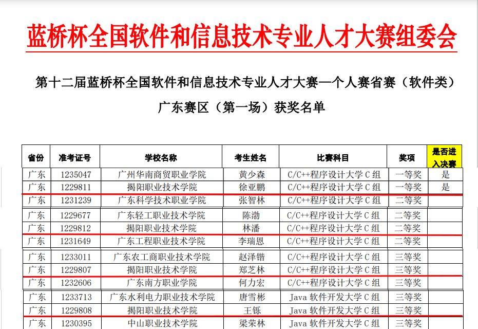 4月28日,从工业和信息化部人才交流中心主办的第十二届“蓝桥杯”全国软件和信息技术专业人才大赛广东省赛区组委会传来喜讯,德赢官网信息工程系4名学生在众多选手中脱颖而出,再创佳绩。其中,由薛晓桂老师指导的学生徐亚鹏勇夺软件类C/C++程序设计赛项一等奖,并成功晋级将于6月初举行的全国总决赛。由林洁新老师指导的学生林潘获得二等奖,由李宗辉、刘彩琼指导的学生郑芝林、王铄均获得三等奖。