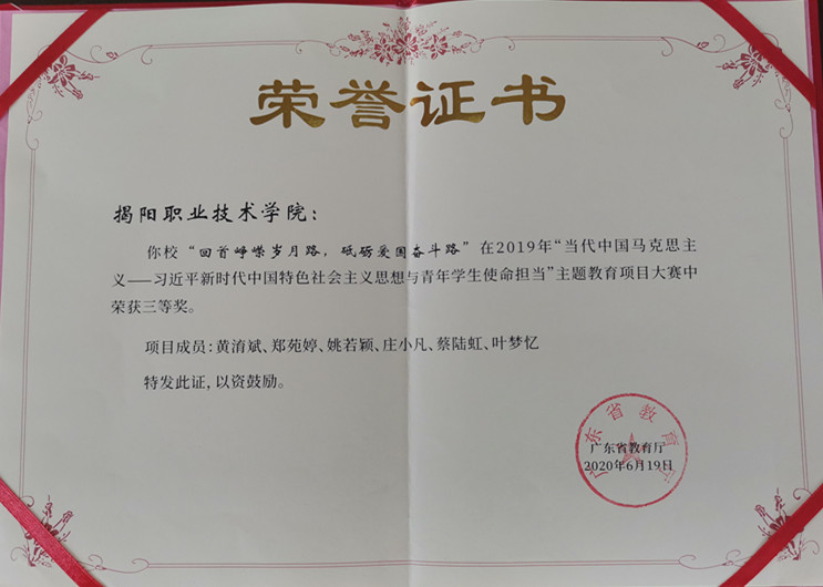 德赢官网“回首峥嵘岁月路,砥砺爱国奋斗路”项目在广东省教育厅举办的2019年“当代中国马克思主义——习近平新时代中国特色社会主义思想与青年学生使命担当”主题教育项目大赛中荣获三等奖。