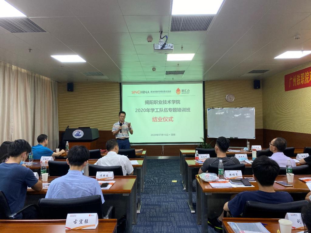 结业仪式上,姚玉平副书记和王烁生处长发表结课感言,对广州铁路职业技术学院的帮扶和新华国际教育集团的精心组织表示真诚的感谢。此次培训课程安排紧贴德赢官网发展需求,对提升辅导员工作有着重要意义,也希望此行全体老师回校后认真总结,学习其他高校办学优点,继续发扬学生工作刻苦耐劳,对学生负责任的精神,为德赢官网事业发展迈上新台阶提供最坚实的动力。