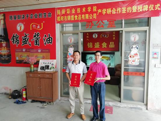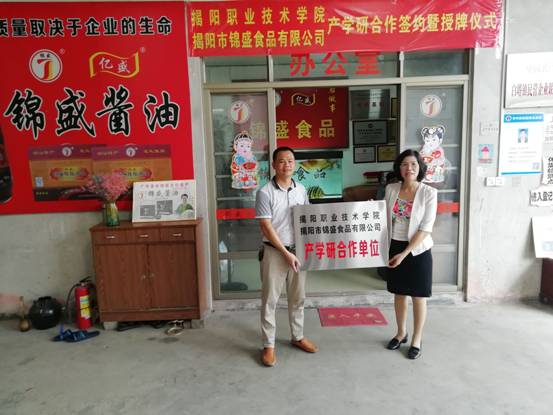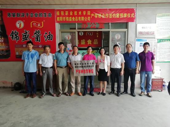 仪式前,与会人员参观了锦盛公司的酱油发酵、灌装、检测等生产车间,了解被列入广东省非物质文化遗产名录的揭阳酱油酿造技艺,探索深入合作、共建产教融合型企业的新模式。仪式中,双方代表签订产学研合作协议书,并举行授牌仪式。仪式后,与会人员进行座谈,校企双方都表示将创新思路,丰富合作的形式和载体,共建共享优质资源和发展成果。