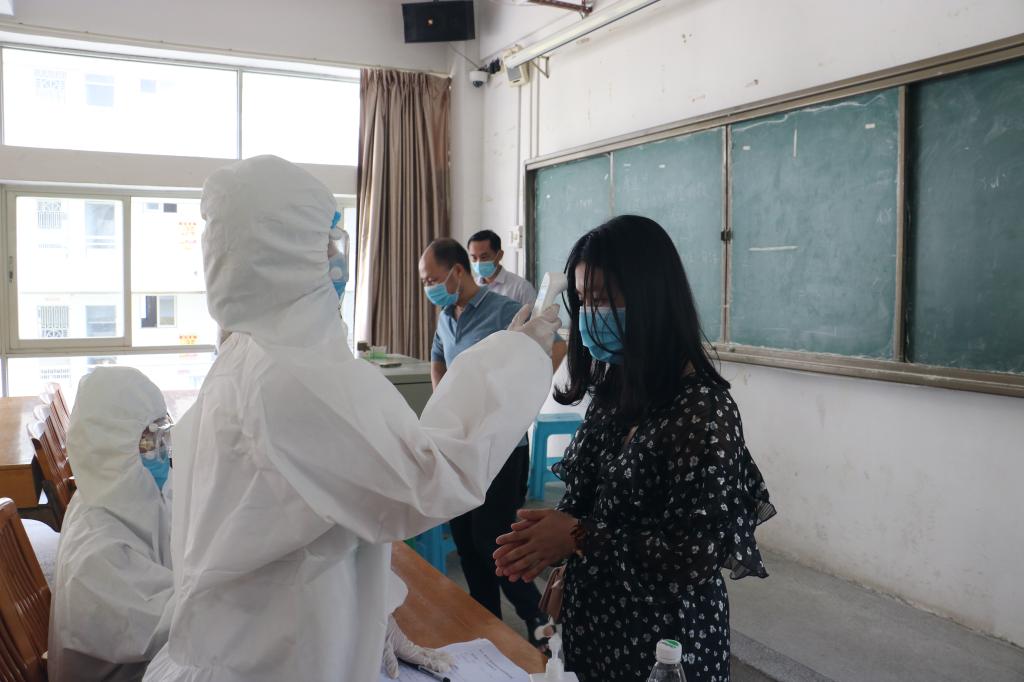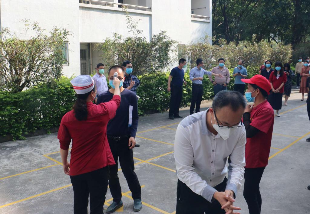 下午3时许,校门口入校等候区设置明显标识并拉好警戒线,模拟演练“学生”戴好口罩凭学生证,以间隔1米以上的距离,从学校大门右侧通道热成像测温通道排队测温,教职工自驾从车辆通道停车检测体温,无异常者可进入校园。随后在课室、实验室进行课堂模拟演练,在学生宿舍及第二食堂分别进行测温登记入住和购餐、用餐场景演练,全程严格执行入室体温检测、现场消毒消杀和保持安全距离的标准。重点模拟演练了发现体温异常症状者时的应急处置流程,及时对发现的异常者做好登记询问和隔离观察,第一时间进行现场消毒消杀等工作,并立即按程序上报有关情况,迅速做好应急处置。