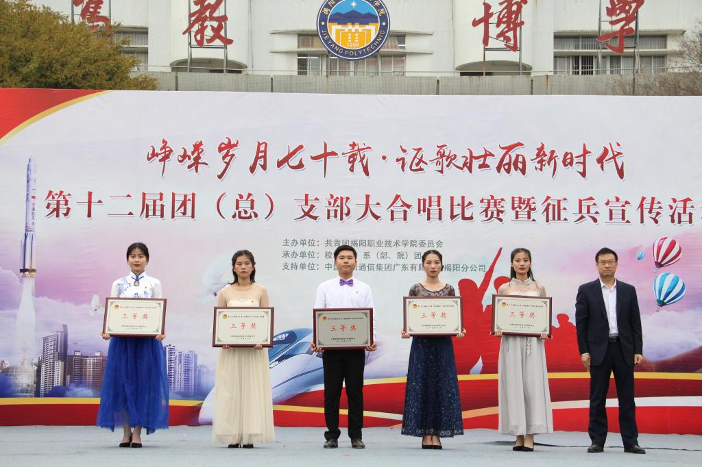 为庆祝中华人民共和国成立70周年,加强学生对党史国史校史教育,激发学生爱党爱国爱校热情,强化大学生国防观念,激发参军报国热情,营造爱国强军的大学文化氛围,11月28日,德赢官网在朝阳广场隆重举办了第十二届团(总)支部大合唱决赛暨征兵宣传活动。校党委副书记、院长龚善初,校党委副书记、纪委书记姚玉平,学生工作处处长(校团委)负责人,各系党总支负责人,以及各系(部、院)团总支书记、辅导员、教职员工和学生共5000多人一同观看本次比赛。
