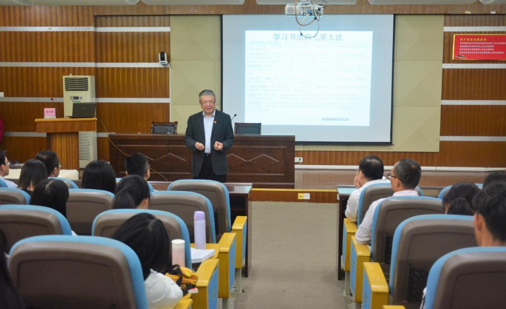 座谈会后,张竹筠书记在学校教学楼AT21会议室举行了一场题为《培养伴随终生的艺术爱好》的讲座,李文升书记参加并主持了讲座,学校学生工作处负责人、各系(部、院)党总支负责人及辅导员、学生代表聆听了讲座。张竹筠书记是国内知名书法家,具有深厚隶书功底,并且连续两届担任教育部创新创业指导委员会委员,讲座上他通过“为什么要培养艺术爱好”“学习书法的七星大法”“学练《曹全碑》的体会”等翔实内容,倾其心得,娓娓说道,让与会者深受艺术熏陶。讲座结束后,张书记还进行了艺术创作,现场墨香四溢,创作挥洒自如,书法技艺精湛,作品美轮美奂,让师生们品味了一顿回味无穷的艺术大餐。