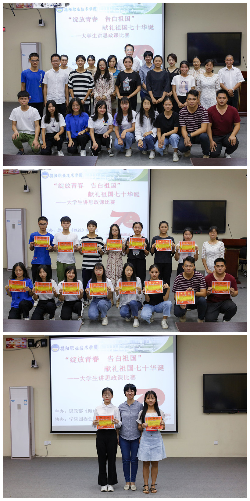 比赛过程中参赛选手们从他们的角度来阐述对思政课的理解。通过紧张激烈的角逐,钟洁生老师指导的“壮丽七十载,奋进新时代”所在的主创团队许佩芬和黎佳璇代表队获得一等奖、洪曼丽老师指导的“爱国不是口号”所在主创团队袁海玲和卢丽丹代表队及钟洁生老师指导的“家国情怀”所在主创团队邱梓敏和吴承羲代表队获得二等奖。各个获奖队伍均深刻体现了学生对思政课教学内容的认识和思考,充分展现新时代大学生的马克思主义理论素养和精神风貌。