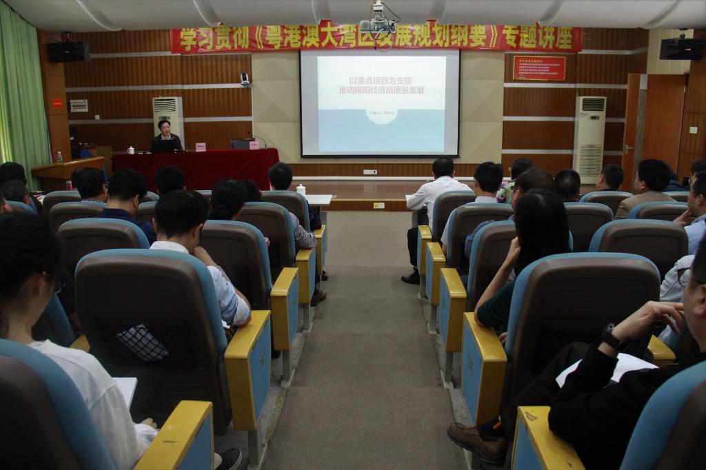 讲座上,黄伟忠局长以经济学理论为基础,结合当前国情和时代形势,用详实的数据、丰富的实例,从揭阳经济社会基本情况;以基础设施大建设推动我市“创湾区融入地”;以重大产业平台大发展助力我市打造“粤东发展极”和我市下一步工作重点四个方面展开论述。全面深入地剖析了《粤港澳大湾区发展规划纲要》中有关推动揭阳发展的战略布局。同时表示,为争创湾区融入地,我们应该认真落实市委六届六次全会总体部署和《市政府工作报告》要求,做好基础设施大建设和重大产业平台大发展,着力培育经济新增长极,不断发展壮大实体经济,深化五大区域改革,努力构建区域发展新格局。