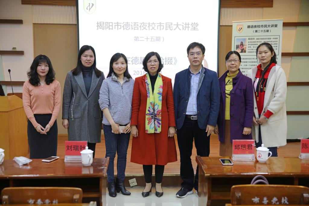 根据工作安排,会后陈跃玲代表学员开讲第一场学习交流分享讲座(市民大讲堂第25期)。陈跃玲从自身在德经历着手,把德语学习结合到“衣食住行”四个方面,深入浅出地为大家介绍中德文化的差异。同时,还对在德国日常生活中常用的德语进行了现场教学并交流互动,现场观众踊跃提问,陈跃玲也一一做出回答,现场气氛十分活跃。
