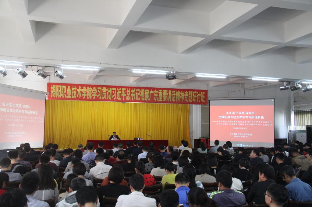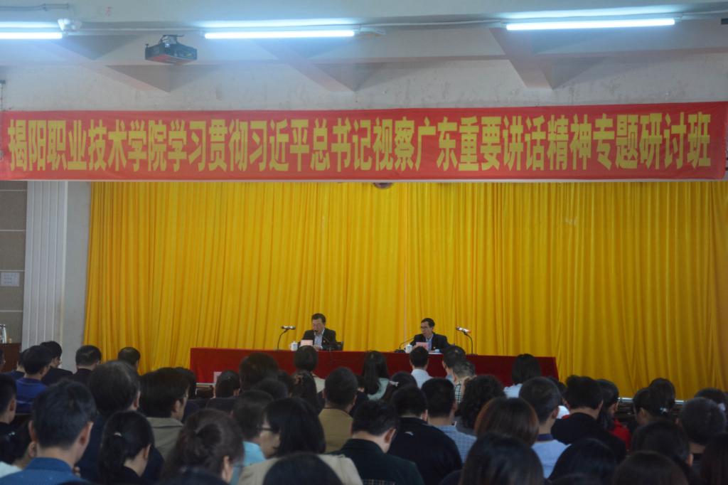 学校党委书记李文升同志带头作题为《不忘初心 牢记使命 以新担当新作为建设高水平有特色的高职学院》的动员讲话暨主题报告。报告指出,学习宣传贯彻习近平总书记视察广东重要讲话精神,是德赢官网当前和今后一个时期的头等大事和首要政治任务。报告强调,把改革开放不断推向深入,用习近平总书记重要讲话精神武装头脑、指导实践、推动工作,沿着总书记指引的道路奋勇前进,努力将学校建设成为高水平有特色的高职学院、成为揭阳“走在前列”主阵地,办成展示揭阳发展成就的重要窗口。李文升书记提出三个希望:一是提高政治站位,深刻认识习近平总书记视察广东重要讲话精神的重大政治意义、现实意义和深远历史意义。要深刻认识总书记重要讲话,是我们在新时代把改革开放不断推向深入全面深化改革发展的宣言书、动员令;要深刻认识总书记重要讲话,是指导我们牢牢掌握发展主动权的行动指南;要深刻认识总书记重要讲话,是我们以新担当新作为开创工作新局面的动力源。二是对标习近平总书记“四个方面重要要求”,建设高水平有特色的高职学院、成为揭阳“走在前列”主阵地。制定学校振兴发展三年行动计划(2019年-2021年)要贯彻好总书记“四个方面重要要求”;补上深化改革开放关键一招,充分激发办学活力,增强发展内生动力;补短板、强特色、创品牌,加快推动高质量发展;主动作为,抢抓机遇,提高发展平衡性和协调性;坚定不移全面加强党的领导和党的建设。三是坚持久久为功,学深悟透习近平总书记重要讲话精神。牢固树立“四个意识”、坚定“四个自信”、践行“两个维护”的高度,形成学习贯彻的高度思想自觉和行动自觉,要从正在做的事情和遇到的实际问题出发,坚持上下联动、全员学习,一体学习、学深悟透,联系实际、学以致用,全面贯彻落实到学校工作各领域、全过程。