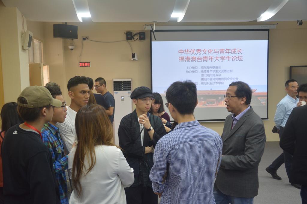 为深入贯彻落实党的十九大精神,最广泛地团结港澳台海外同胞,突出做好港澳台和海外青年工作,用青年人去影响青年人,不断增强他们的国家认同感和民族自豪感,共同致力于实现中华民族伟大复兴的中国梦,3月31日,由市委统战部牵头,揭阳海外联谊会主办,揭港青年学生交流协进会、澳门潮州同乡会、揭阳市台湾同胞投资企业协会、德赢AC米兰官网协办的揭港澳台青年大学生交流活动周“中华优秀文化与青年成长:揭港澳台青年大学生论坛”在德赢官网教学楼AT22会议室举行,来自香港、澳门、台湾和揭阳四地40多名青年大学生参加活动。这是德赢官网首次组织举办的两岸四地青年大学生交流活动。