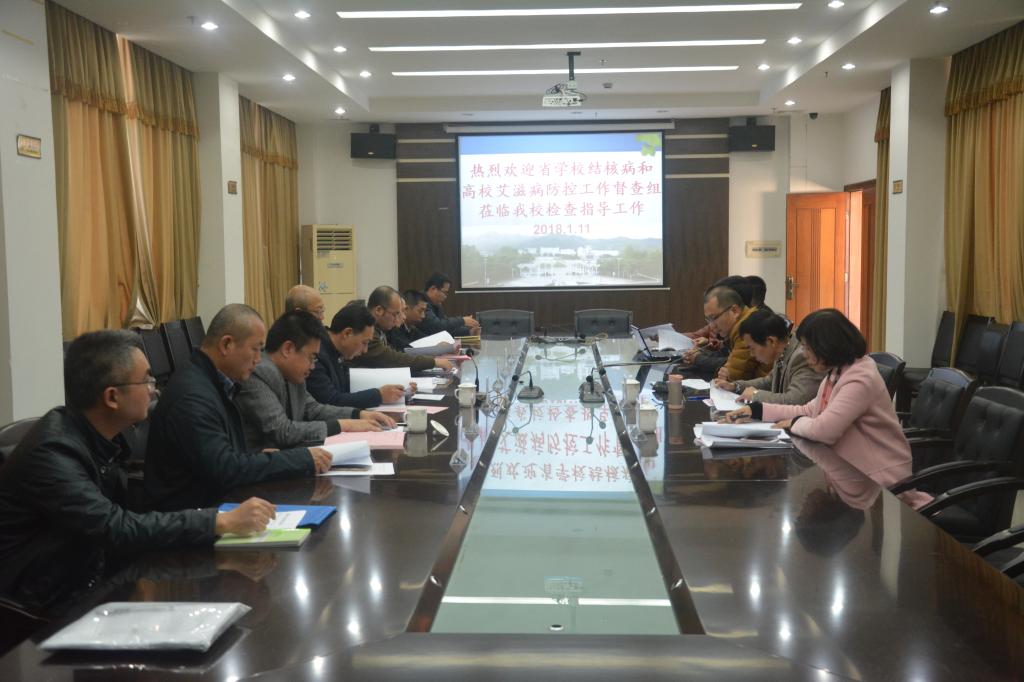 1月11日下午,省卫计委、教育厅检查组许顺兴、麦锦城、吴惠忠、刘盛元等一行4人,在市卫计局、教育局有关领导的陪同下莅临德赢官网。检查指导德赢官网结核病和艾滋病防控工作。检查汇报会在行政楼507会议室举行,学校党委书记李文升、院长龚善初、副院长刘瑞叶、后勤服务处负责人黄新鹏等有关人员参加会议。会议由副院长刘瑞叶主持。