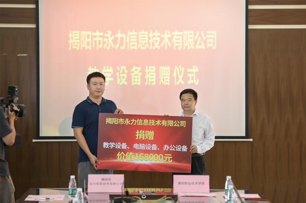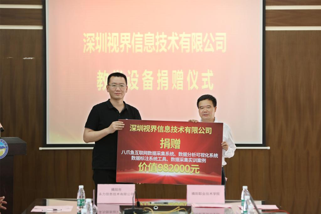 随后,双方签订了大数据创新工作坊合作协议书。揭阳市永力信息技术有限公司、深圳视界信息技术有限公司现场分别向学校捐赠了价值16.8万元的教学、办公设备和价值98.2万元的教学软件、教学系统等教学资源,用于支持大数据创新工作坊建设和人才培养。