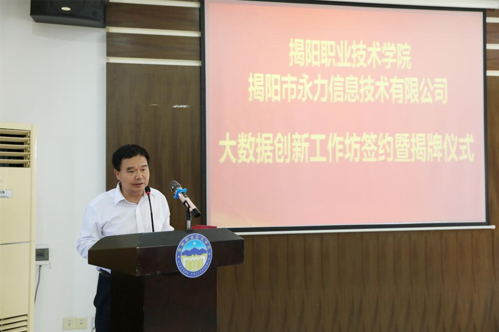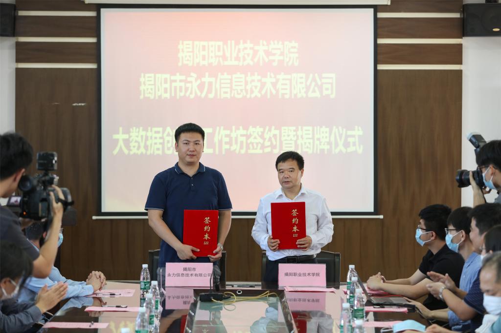 为了进一步深化产教融合,健全多元化办学格局,5月19日下午,学校与揭阳市永力信息技术有限公司在行政楼507会议室举行校企协同育人平台“大数据创新工作坊”签约暨揭牌仪式。院长罗恢远、副院长李桂鑫、党委委员张汉良、实训与信息中心主任李镇伟、信息工程系相关领导、教师,深圳视界信息技术有限公司副总裁黄树煜、市场总监董晴、高校事业部总监刘凯、揭阳市永力信息技术有限公司总经理池一昉、副总经理陈志超等企业领导参加了活动。