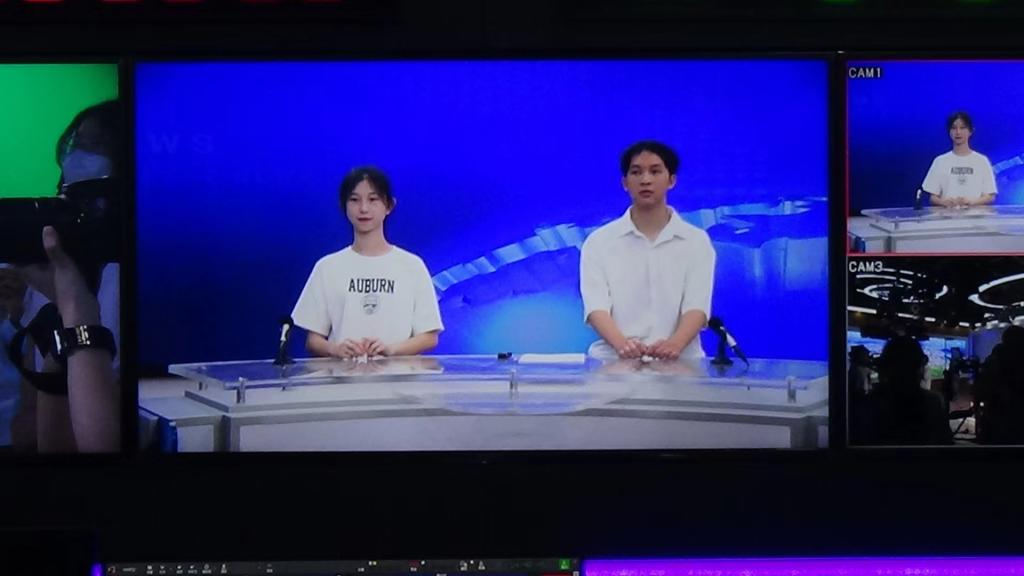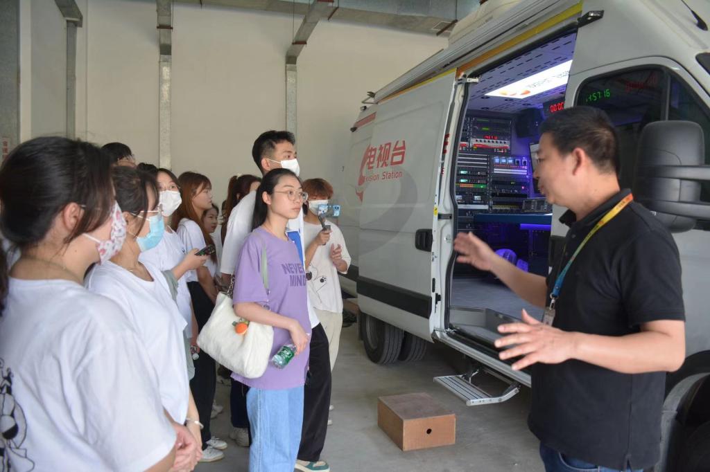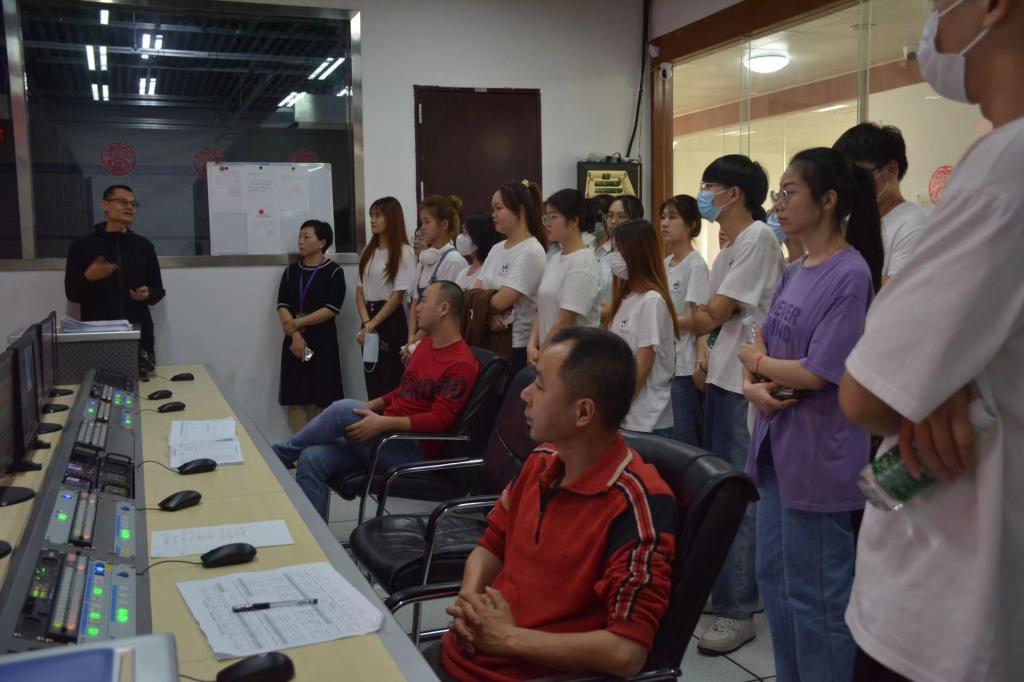 在工作人员的引领下,同学们先后参观了电视台演播厅、电视直播车,了解媒体新闻制作过程中信号传输专业设备的操作方法。在多景区演播室,同学们亲身体验了模拟电视新闻播报场景,并近距离观摩了广播节目直播现场。在座谈交流会上,广播电视台的新闻工作者前辈为同学们详细介绍了新闻节目录制、节目播出流程和融媒建设发展等新闻生产相关知识,让同学们了解媒体工作的同时,深刻意识到作为新闻工作者需要有耐心、恒心和对新闻工作的热爱。