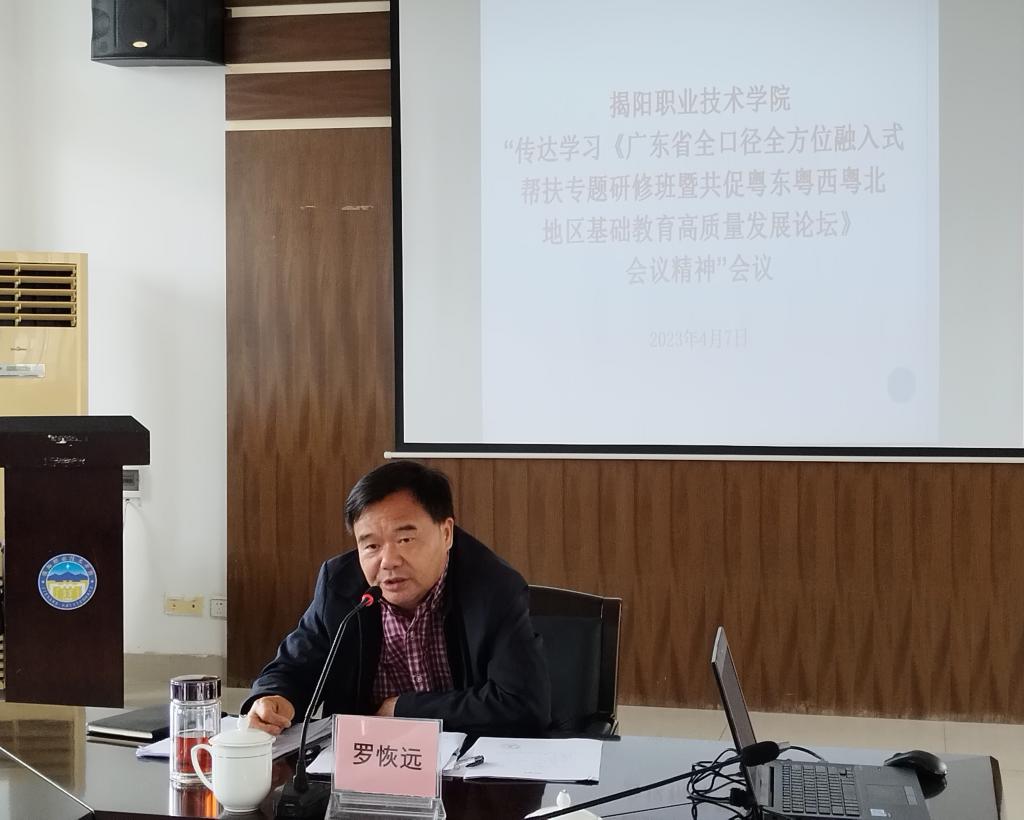 为了扎实推进2023年学校对口帮扶普宁市基础教育工作的落实,4月7日上午9:30,学校在行政楼507会议室召开“传达学习《广东省全口径全方位融入式帮扶专题研修班暨共促粤东粤西粤北地区基础教育高质量发展论坛》会议精神”会议。校党委副书记、院长罗恢远,党委委员、副院长刘瑞叶,党委委员、组织人事处处长张汉良出席了本次会议。会议由刘瑞叶同志主持。
