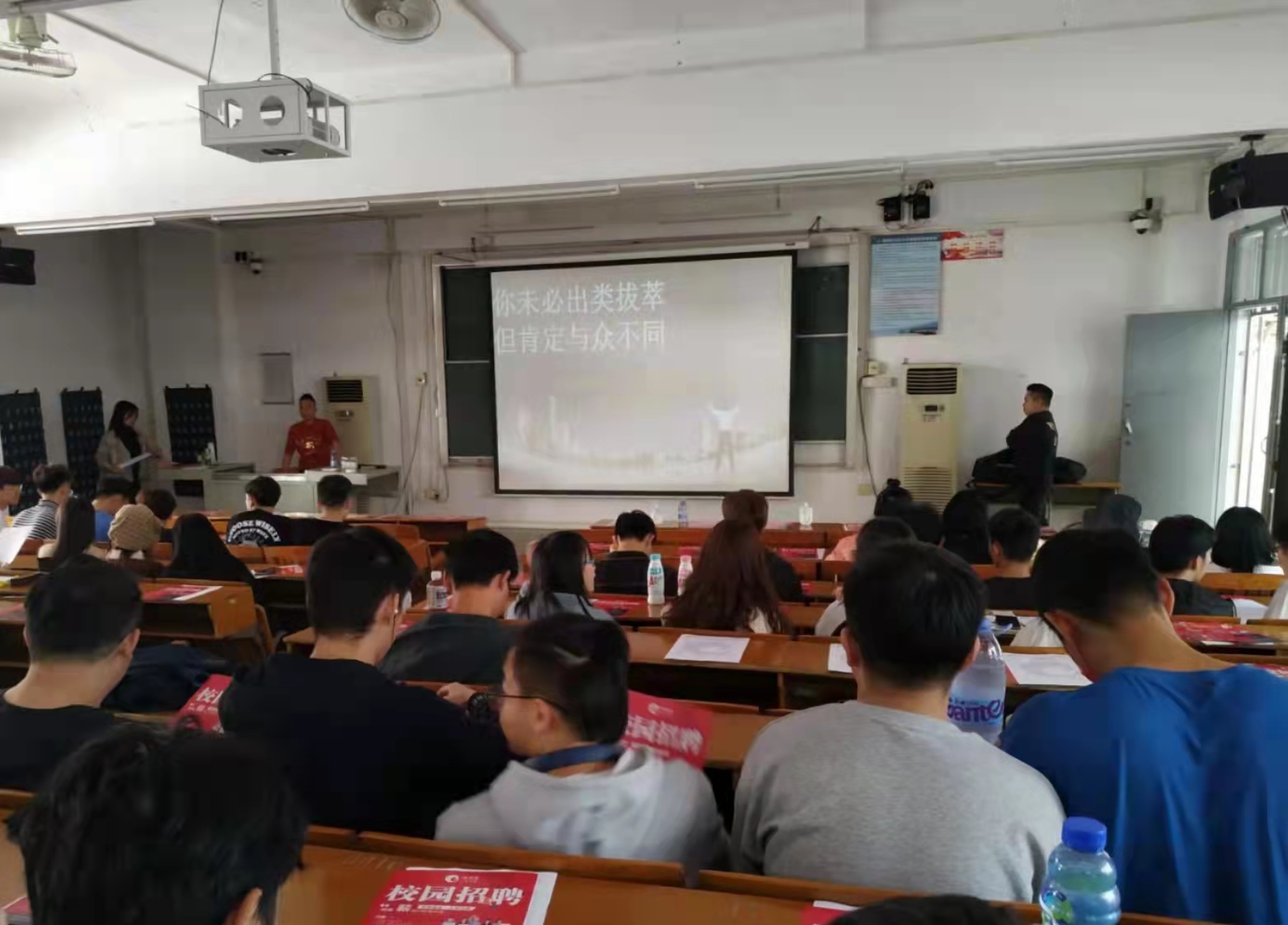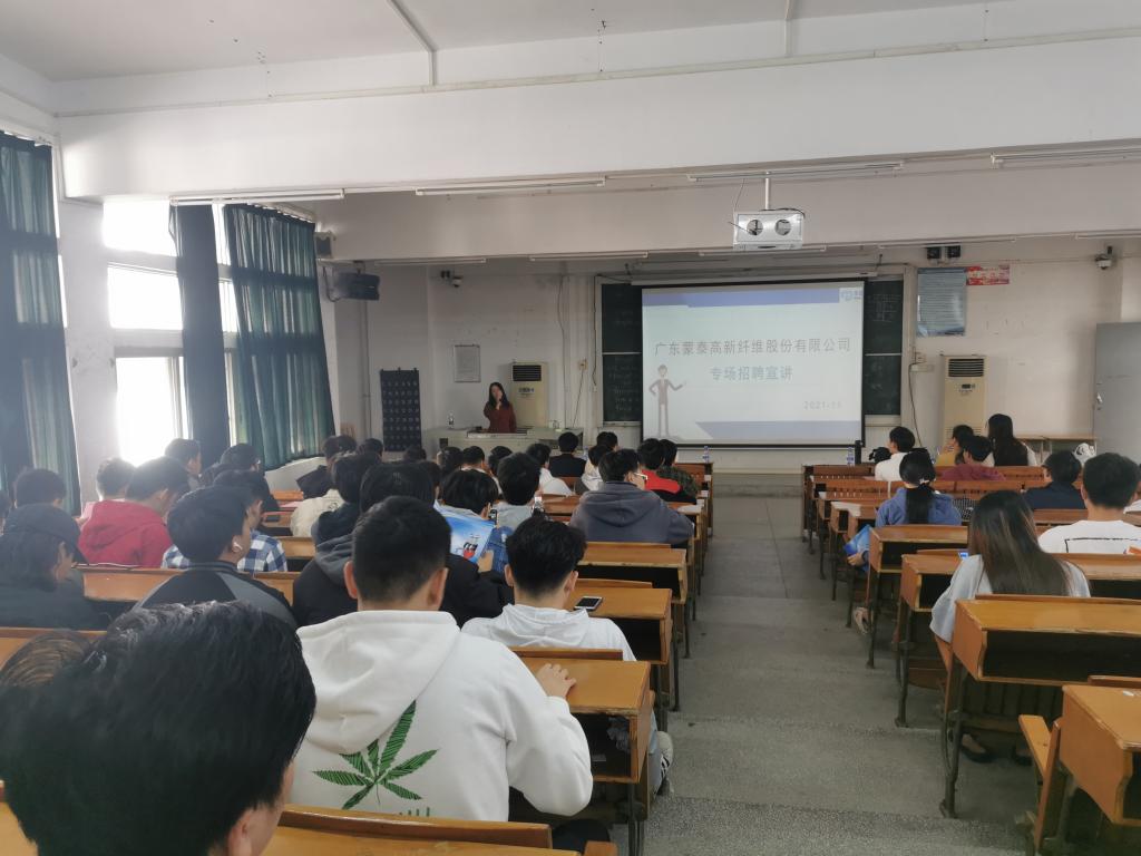 两家公司分别向同学们系统地介绍了公司的发展历程、发展理念、发展现状及未来规划、产业结构、企业文化、人才策略等基本情况。同学们纷纷与企业方就岗位要求、福利待遇、发展机遇等问题进行了现场交流,气氛十分活跃。鸿德源公司董事长吴乔生先生亲自参加宣讲会,并回答同学们提出的问题。广东蒙泰高新纤维股份有限公司人力资源总监万小燕也介绍了公司的发展壮大历程,表达了渴望同学们加入该公司的愿望。