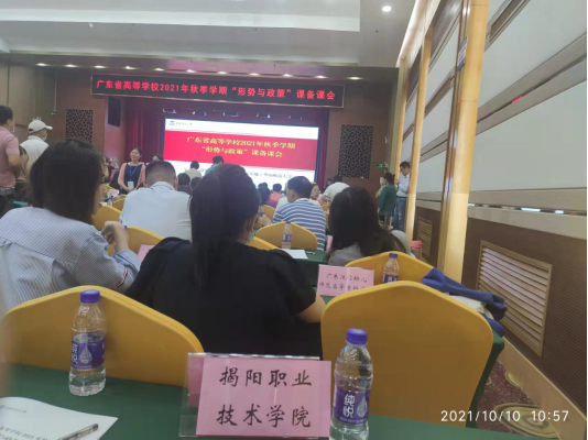 为贯彻落实教育部《关于加强新时代高校“形势与政策”课建设的若干意见》精神,加强对我省高校“形势与政策”课的教学指导,广东省教育厅于10月10日在广州市东山宾馆会议中心举办了2021年秋季“形势与政策”课备课会。思政部洪曼丽主任、陈树鹏老师参加了本次会议。