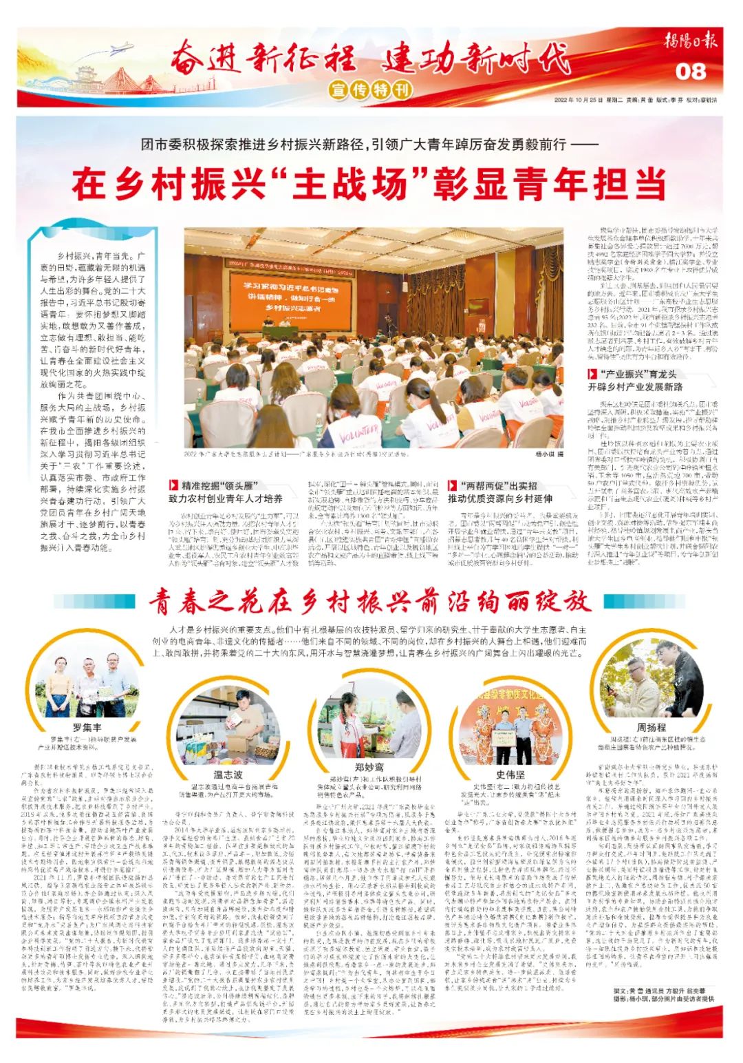 作为共青团围绕中心、服务大局的主战场,乡村振兴赋予青年新的历史使命。在我市全面推进乡村振兴的新征程中,揭阳各级团组织深入学习贯彻习近平总书记关于“三农”工作重要论述,认真落实市委、市政府工作部署,持续深化实施乡村振兴青春建功行动,引领广大党团员青年在乡村广阔天地施展才干、逐梦前行,以青春之我、奋斗之我,为全市乡村振兴注入青春动能。