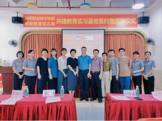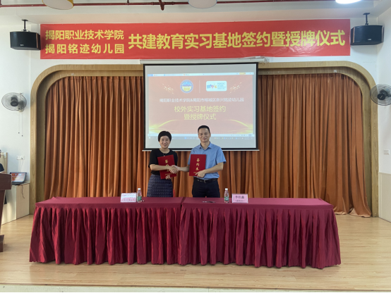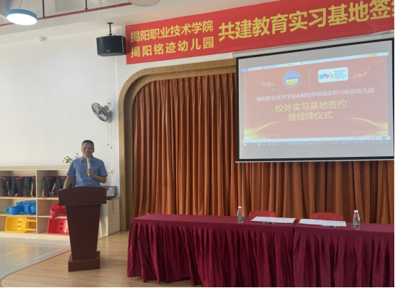 9月27日下午,德赢官网在揭阳市榕城区新兴铭迹幼儿园大厅举行了“德赢AC米兰官网与揭阳市榕城区新兴铭迹幼儿园共建教育实习基地签约暨授牌仪式”,副院长李桂鑫、师范教育系主任李汉潮、铭迹幼儿园副董事长林小婉、新兴铭迹幼儿园园长孙桂芳、新兴铭迹幼儿园助理林薇、东升铭迹幼儿园园长林敏钰、锡场铭迹幼儿园园长江悦填以及师范教育系、实训与信息中心相关老师等参加了活动。