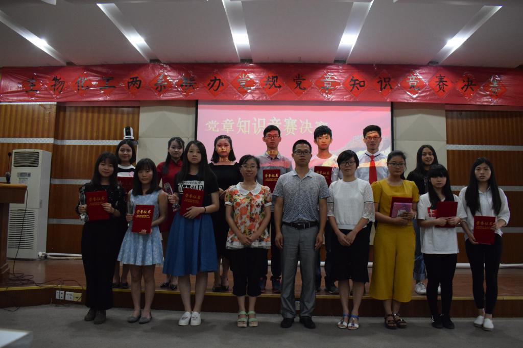 为继续深入开展“学党章党规、学系列讲话、做合格党员”学习教育活动,推进“两学一做”形成常态化制度化,化学工程系与生物工程系于2017年5月18日下午在教学楼AT21联合举办党章知识竞赛决赛。两系的党员、入党积极分子、积极向党组织靠拢的师生参加了比赛活动。化学工程系党总支赖少坤书记观看了本次比赛,化工系学生党支书记刘淑媛老师及生物系学生党支书记林卫霞老师担任了评委。