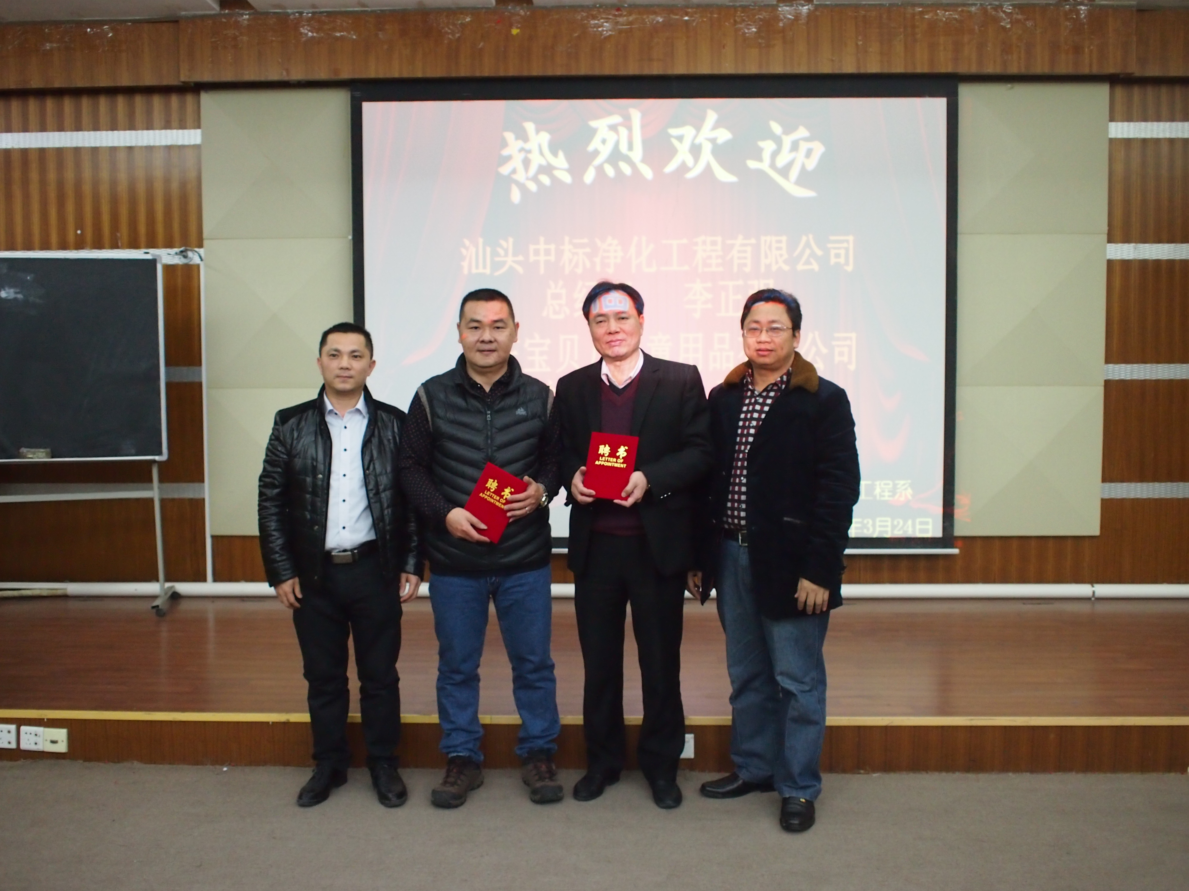 2016年3月24日下午,应化工系领导邀请,汕头中标净化工程有限公司总经理李正强、工程师蔡岳生,广东宝贝儿婴童用品有限公司技术总监夏冷来我院进行学术交流,在与化工系老师座谈交流之后,李正强先生在教学楼AT21为我院师生作了《GMPC净化工程在化妆品工艺中的应用》的专题讲座。讲座由林壮森老师主持,化工系江英志主任、江贵波老师、王宜民老师、林壮森老师、刘淑媛老师、陈敏杰老师等及化工系学生到场聆听讲座。
