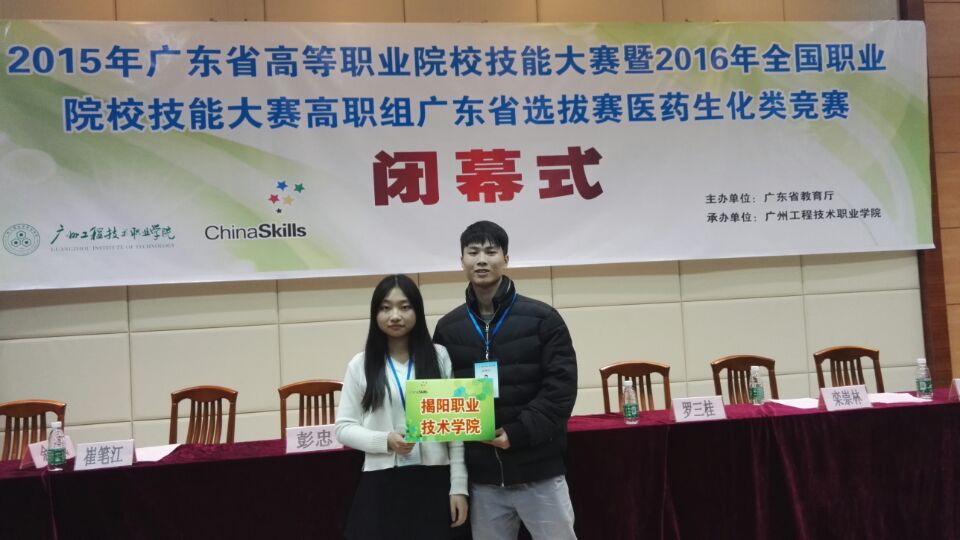 2015年广东省高等职业院校技能大赛暨2016年全国职业院校技能大赛高职组广东省选拔赛“工业分析检验”赛项于2015年12月29日-31日在广州工程技术职业学院举行。我院化学工程系参赛队伍(学生:蓝玉婷、任铭豪;指导老师:林壮森、谢晓龙),在全省30支参赛队伍中脱颖而出,取得第7名的好成绩,荣获二等奖。
