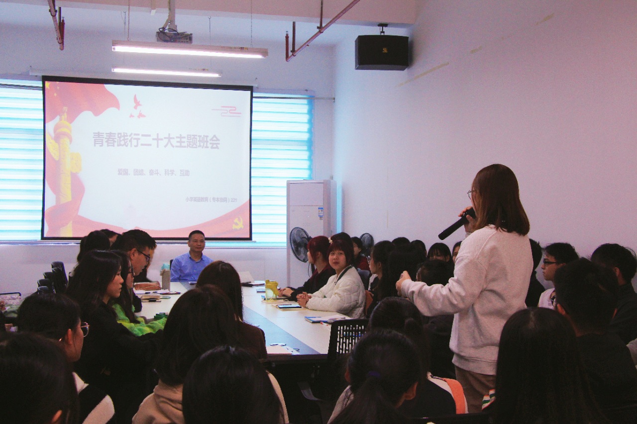 为深入学习宣传贯彻党的二十大精神,激励青年学生以新姿态、新面貌投入到新学期的学习生活中,3月3日,学院党委委员、副院长李桂鑫深入外语系英语教育专本协同221班参加“青春践行二十大”主题班会。班会以座谈会的形式展开,由班主任林畅老师主持。