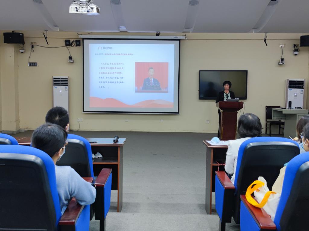 洪曼丽主任以党代会小常识为切入点,向同学们普及了党代会的相关常识,授课中洪主任紧紧围绕党的二十大的主题和核心内容、过去五年的工作和新时代十年的伟大变革、党的二十大报告的新观点新论断新思想、党的二十大对青年学生的使命要求等四个方面对党的二十大精神进行专题讲授,引导和鼓舞青年学生把思想和行动统一到党的二十大精神上来,自信自强、守正创新,踔厉奋发、勇毅前行,共同推动中华民族伟大复兴号巨轮乘风破浪、扬帆远航。