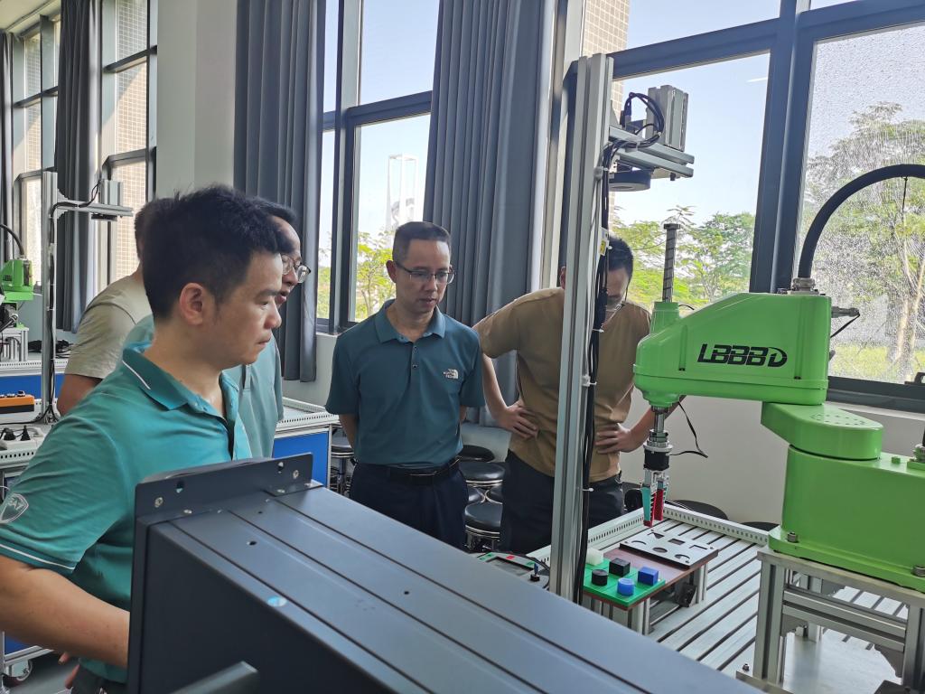 在智能制造系副主任白仲明的带领下,交流团参观了广工揭阳校区教学基础设施,了解校园的整体建设,参观了机械电子工程专业和电气工程及其自动化专业等实验室,双方教师就学科教学开展、实验设备的技术参数以及实验管理等展开讨论,交流经验。