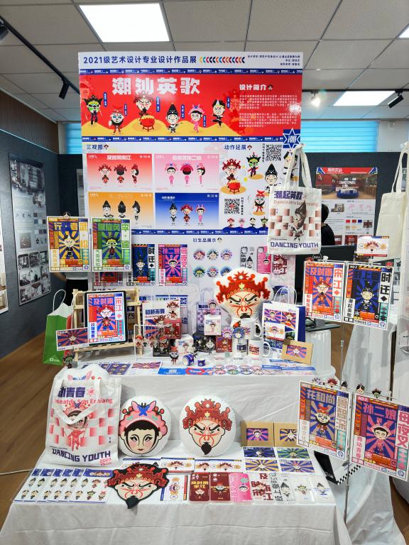 2021级艺术设计专业设计作品展展出了2021级艺术设计专业同学30余件设计作品,主题涵盖平面设计(文创产品设计、包装设计)和室内空间设计两个大类。将潮汕本土设计元素及中国传统设计形式进行再创新是本次平面设计类作品的一大亮点。其中黎佳乐同学的作品《潮汕英歌》,选取了英歌舞中的人物、色彩、动作等作为设计元素,将英歌舞中的人物转化为一个个形IP,通过有效的设计,创造出满足群众消费需求与精神文化需求的产品。在空间设计方面,涵盖了居住空间、展示空间、餐饮空间等多种空间形式,其中杨胜同学的作品《半杯白》就以法式复古风作为设计基调,细致的勾勒出一处温馨怡人的餐饮空间。本次毕业作品从主题选定到最终落成完成历时近一个半月,充分展现了学生们综合运用设计知识、进行独立分析和解决实际问题的能力。