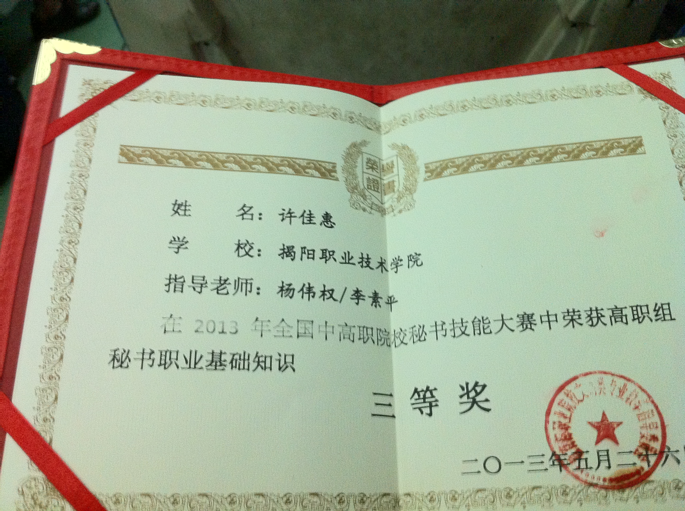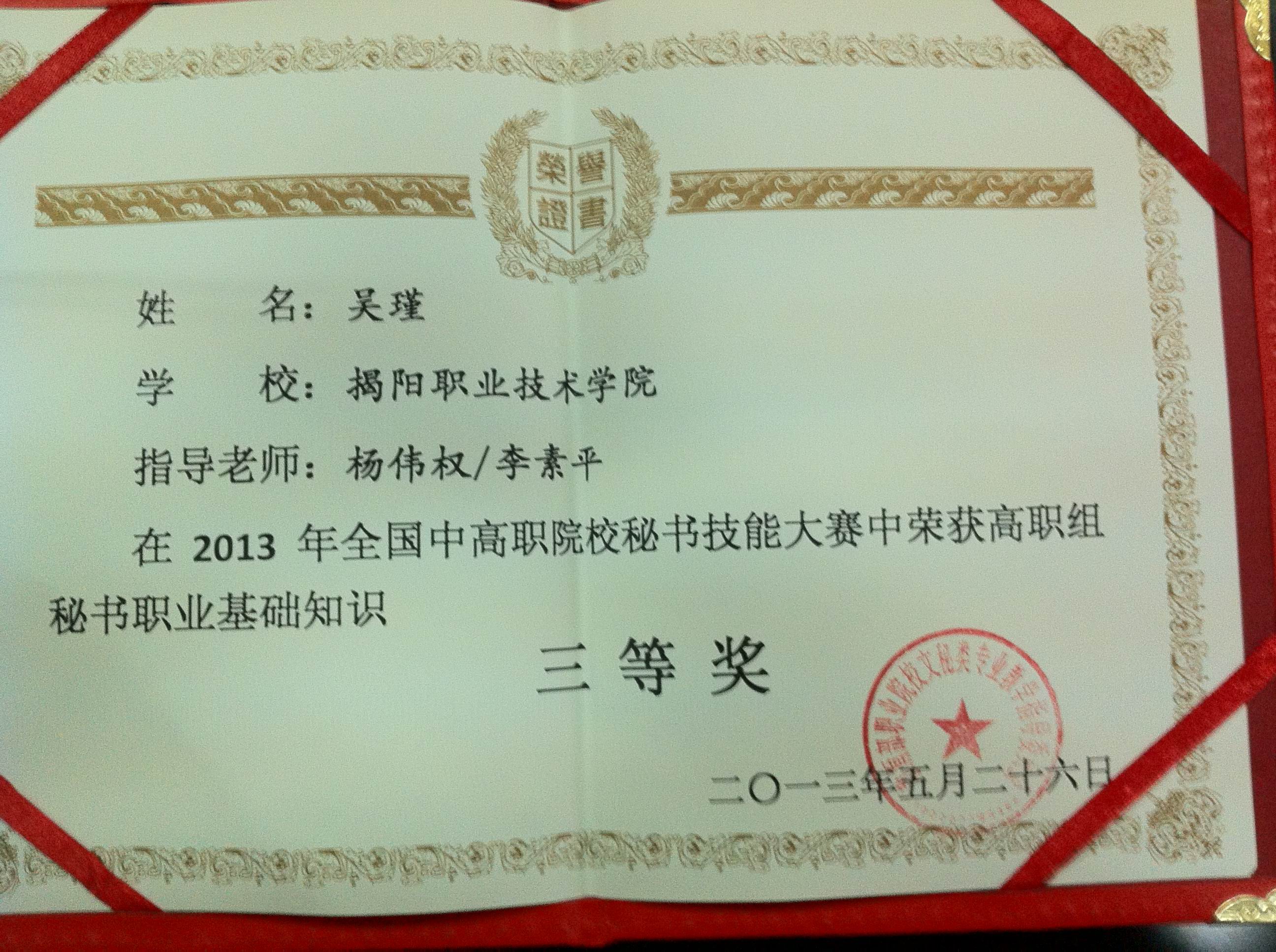 我院参赛队由教务处副处长杨伟权带队,文秘教研室主任李素平担任指导老师。比赛共有五个环节,即秘书职业基础知识测试,改正错别字、修改病句测试,文字输入速度测试,秘书实务技能测试,口语表达(含自我介绍、即兴演讲)比赛,经过紧张激烈的角逐,我院文秘专业2011级许佳惠、吴瑾分别获得高职组秘书职业基础知识三等奖。